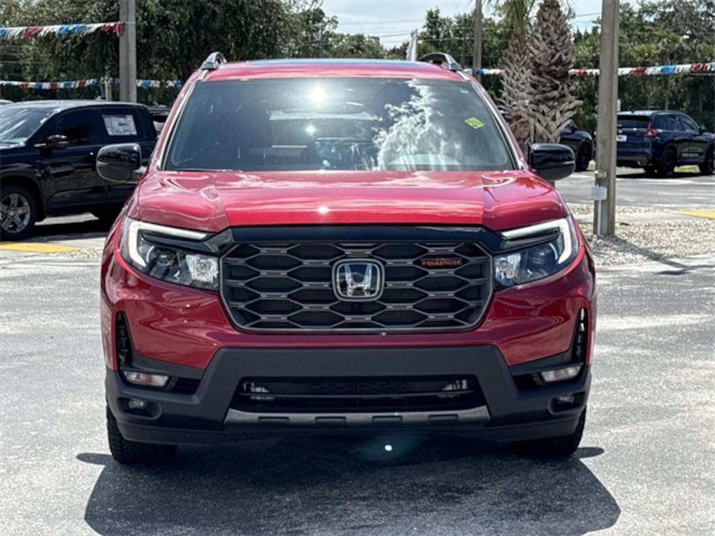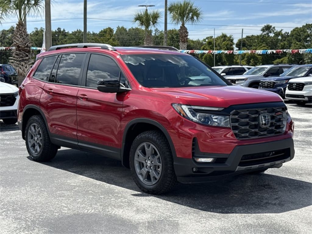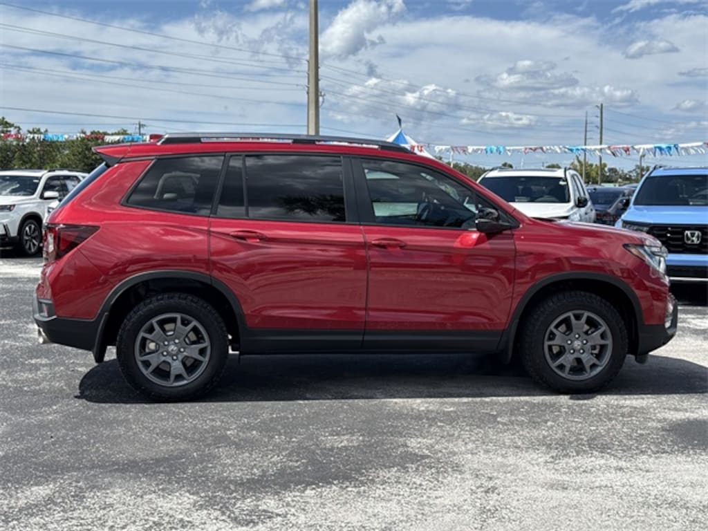 HondaTrue Certified Certified, Navigation system: Honda Satellite-Linked Navigation System, 4-Wheel Disc Brakes, 7 Speakers, A/V remote: CabinControl, ABS brakes, Air Conditioning, Alloy wheels, AM/FM radio: SiriusXM, Apple CarPlay/Android Auto, Auto High-beam Headlights, Auto-dimming Rear-View mirror, Automatic temperature control, Blind Spot Information (BSI) System warning, Brake assist, Bumpers: body-color, Compass, Cruise Control, Delay-off headlights, Driver door bin, Driver vanity mirror, Driver's Seat Mounted Armrest, Dual front impact airbags, Dual front side impact airbags, Electronic Stability Control, Emergency communication system: HondaLink Assist, Four wheel independent suspension, Front anti-roll bar, Front Bucket Seats, Front Center Armrest, Front dual zone A/C, Front fog lights, Front reading lights, Fully automatic headlights, Garage door transmitter: HomeLink, Heated door mirrors, Heated Front Bucket Seats, Heated front seats, Illuminated entry, Lane departure: Lane Keeping Assist System (LKAS) active, Leather-Trimmed Seats, Low tire pressure warning, Occupant sensing airbag, Outside temperature display, Overhead airbag, Overhead console, Panic alarm, Passenger door bin, Passenger seat mounted armrest, Passenger vanity mirror, Power door mirrors, Power driver seat, Power Liftgate, Power moonroof, Power passenger seat, Power steering, Power windows, Radio data system, Radio: 215-Watt Audio System w/7 Speakers, Rear air conditioning, Rear anti-roll bar, Rear reading lights, Rear seat center armrest, Rear View Camera, Rear window defroster, Rear window wiper, Remote keyless entry, Security system, Speed-sensing steering, Split folding rear seat, Spoiler, Steering wheel mounted audio controls, Tachometer, Telescoping steering wheel, Tilt steering wheel, Traction control, Trip computer, Turn signal indicator mirrors, Variably intermittent wipers, and Wheels: 18" Pewter Gray Alloy. LEATHER!!!, HONDA CERTIFIED!!!, HondaTrue Certified Certified, Navigation system: Honda Satellite-Linked Navigation System, 4-Wheel Disc Brakes, 7 Speakers, A/V remote: CabinControl, ABS brakes, Air Conditioning, Alloy wheels, AM/FM radio: SiriusXM, Apple CarPlay/Android Auto, Auto High-beam Headlights, Auto-dimming Rear-View mirror, Automatic temperature control, Blind Spot Information (BSI) System warning, Brake assist, Bumpers: body-color, Compass, Cruise Control, Delay-off headlights, Driver door bin, Driver vanity mirror, Driver's Seat Mounted Armrest, Dual front impact airbags, Dual front side impact airbags, Electronic Stability Control, Emergency communication system: HondaLink Assist, Four wheel independent suspension, Front anti-roll bar, Front Bucket Seats, Front Center Armrest, Front dual zone A/C, Front fog lights, Front reading lights, Fully automatic headlights, Garage door transmitter: HomeLink, Heated door mirrors, Heated Front Bucket Seats, Heated front seats, Illuminated entry, Lane departure: Lane Keeping Assist System (LKAS) active, Leather-Trimmed Seats, Low tire pressure warning, Occupant sensing airbag, Outside temperature display, Overhead airbag, Overhead console, Panic alarm, Passenger door bin, Passenger seat mounted armrest, Passenger vanity mirror, Power door mirrors, Power driver seat, Power Liftgate, Power moonroof, Power passenger seat, Power steering, Power windows, Radio data system, Radio: 215-Watt Audio System w/7 Speakers, Rear air conditioning, Rear anti-roll bar, Rear reading lights, Rear seat center armrest, Rear View Camera, Rear window defroster, Rear window wiper, Remote keyless entry, Security system, Speed-sensing steering, Split folding rear seat, Spoiler, Steering wheel mounted audio controls, Tachometer, Telescoping steering wheel, Tilt steering wheel, Traction control, Trip computer, Turn signal indicator mirrors, Variably intermittent wipers, Wheels: 18" Pewter Gray Alloy, Navigation system: Honda Satellite-Linked Navigation System. 2025 Honda Passport TrailSport Radiant Red Metallic I
