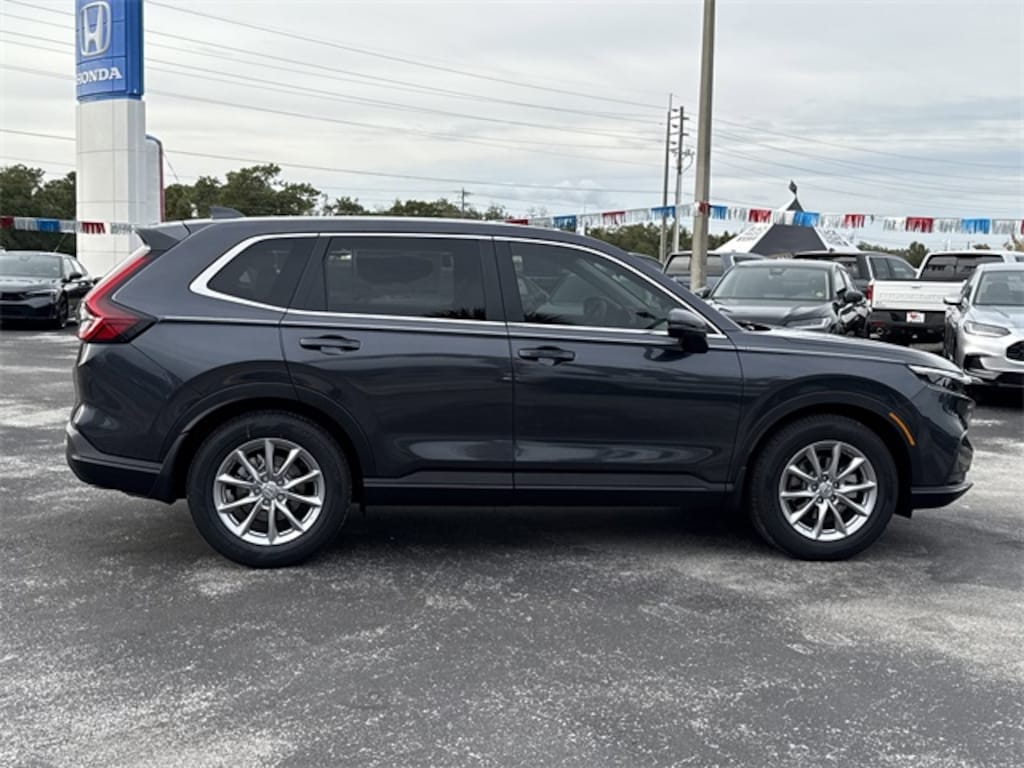 2026 Honda CR-V EX 4-Wheel Disc Brakes, 6 Speakers, ABS brakes, Adaptive Cruise Control: Adaptive Cruise Control (ACC) with Low-Speed Follow, Air Conditioning, Alloy wheels, AM/FM radio, Apple CarPlay/Android Auto, Auto High-beam Headlights, Automatic temperature control, Blind Spot Information (BSI) System warning, Brake assist, Bumpers: body-color, Cloth Seat Trim, Compass, Cruise Control, Delay-off headlights, Driver door bin, Driver vanity mirror, Dual front impact airbags, Dual front side impact airbags, Electronic Stability Control, Four wheel independent suspension, Front anti-roll bar, Front Bucket Seats, Front Center Armrest, Front dual zone A/C, Front reading lights, Fully automatic headlights, Heated door mirrors, Heated Front Bucket Seats, Heated front seats, Illuminated entry, Knee airbag, Low tire pressure warning, Occupant sensing airbag, Outside temperature display, Overhead airbag, Overhead console, Panic alarm, Passenger door bin, Passenger vanity mirror, Power door mirrors, Power driver seat, Power moonroof, Power steering, Power windows, Radio data system, Radio: 240-Watt AM/FM Audio System, Rear anti-roll bar, Rear reading lights, Rear seat center armrest, Rear side impact airbag, Rear View Camera, Rear window defroster, Rear window wiper, Remote keyless entry, Security system, Speed-sensing steering, Speed-Sensitive Wipers, Split folding rear seat, Spoiler, Steering wheel mounted audio controls, Tachometer, Telescoping steering wheel, Tilt steering wheel, Traction control, Trip computer, Turn signal indicator mirrors, Variably intermittent wipers, Wheels: 18" Sparkle Silver.