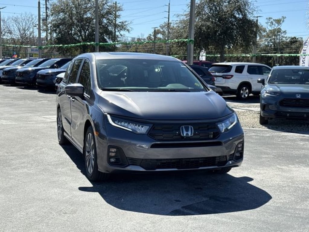 2026 Honda Odyssey Touring 3rd row seats: split-bench, 4-Wheel Disc Brakes, 7 Speakers, ABS brakes, Adaptive Cruise Control: Adaptive Cruise Control (ACC) with Low-Speed Follow, Air Conditioning, Alloy wheels, AM/FM radio: SiriusXM, Anti-whiplash front head restraints, Apple CarPlay/Android Auto, Auto High-beam Headlights, Auto-dimming Rear-View mirror, Automatic temperature control, Blind Spot Information (BSI) System warning, Brake assist, Bumpers: body-color, Compass, Cruise Control, Delay-off headlights, Driver door bin, Driver vanity mirror, Driver's Seat Mounted Armrest, Dual front impact airbags, Dual front side impact airbags, Electronic Stability Control, Emergency communication system: HondaLink, Four wheel independent suspension, Front anti-roll bar, Front Bucket Seats, Front dual zone A/C, Front fog lights, Front reading lights, Fully automatic headlights, Garage door transmitter: HomeLink, Heated door mirrors, Heated Front Bucket Seats, Heated front seats, Illuminated entry, Knee airbag, Lane departure: Lane Keeping Assist System (LKAS) active, Leather steering wheel, Leather-Trimmed Seats with Piping, Low tire pressure warning, Memory seat, Navigation system: Honda Satellite-Linked Navigation System, Occupant sensing airbag, Outside temperature display, Overhead airbag, Overhead console, Panic alarm, Passenger door bin, Passenger seat mounted armrest, Passenger vanity mirror, Power door mirrors, Power driver seat, Power Liftgate, Power moonroof, Power passenger seat, Power steering, Power windows, Radio data system, Radio: 160-Watt AM/FM/HD/SiriusXM Audio System, Rear air conditioning, Rear anti-roll bar, Rear audio controls, Rear reading lights, Rear seat center armrest, Rear View Camera, Rear window defroster, Rear window wiper, Reclining 3rd row seat, Remote keyless entry, Security system, Speed-sensing steering, Speed-Sensitive Wipers, Split folding rear seat, Spoiler, Steering wheel mounted audio controls, Tachometer, Telescoping steering wheel, Tilt steering wheel, Traction control, Trip computer, Turn signal indicator mirrors, Variably intermittent wipers, Wheels: 19" Gray Alloy.