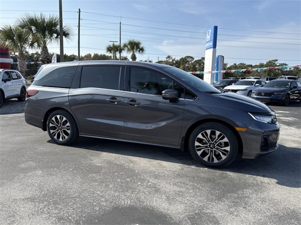 2026 Honda Odyssey Elite 11 Speakers, 3rd row seats: split-bench, 4-Wheel Disc Brakes, ABS brakes, Adaptive Cruise Control: Adaptive Cruise Control (ACC) with Low-Speed Follow, Air Conditioning, Alloy wheels, AM/FM radio: SiriusXM, Anti-whiplash front head restraints, Apple CarPlay/Android Auto, Auto High-beam Headlights, Auto-dimming door mirrors, Auto-dimming Rear-View mirror, Automatic temperature control, Blind Spot Information (BSI) System warning, Brake assist, Bumpers: body-color, Compass, Cruise Control, Delay-off headlights, Driver door bin, Driver vanity mirror, Driver's Seat Mounted Armrest, Dual front impact airbags, Dual front side impact airbags, Electronic Stability Control, Emergency communication system: HondaLink, Four wheel independent suspension, Front anti-roll bar, Front Bucket Seats, Front dual zone A/C, Front fog lights, Front reading lights, Fully automatic headlights, Garage door transmitter: HomeLink, Heated & Ventilated Front Bucket Seats, Heated door mirrors, Heated front seats, Heated steering wheel, Illuminated entry, Knee airbag, Lane departure: Lane Keeping Assist System (LKAS) active, Leather steering wheel, Low tire pressure warning, Memory seat, Navigation system: Honda Satellite-Linked Navigation System, Occupant sensing airbag, Outside temperature display, Overhead airbag, Overhead console, Panic alarm, Passenger door bin, Passenger seat mounted armrest, Passenger vanity mirror, Perforated Leather-Trimmed Seats w/Piping, Power door mirrors, Power driver seat, Power Liftgate, Power moonroof, Power passenger seat, Power steering, Power windows, Radio data system, Radio: 500-Watt AM/FM/HD Premium Audio System, Rain sensing wipers, Rear air conditioning, Rear anti-roll bar, Rear audio controls, Rear reading lights, Rear seat center armrest, Rear View Camera, Rear window defroster, Rear window wiper, Reclining 3rd row seat, Remote keyless entry, Security system, Speed-sensing steering, Speed-Sensitive Wipers, Split folding rear seat, Spoiler, Steering wheel mounted audio controls, Tachometer, Telescoping steering wheel, Tilt steering wheel, Traction control, Trip computer, Turn signal indicator mirrors, Variably intermittent wipers, Ventilated front seats, Wheels: 19" Machine-Finished Alloy.
