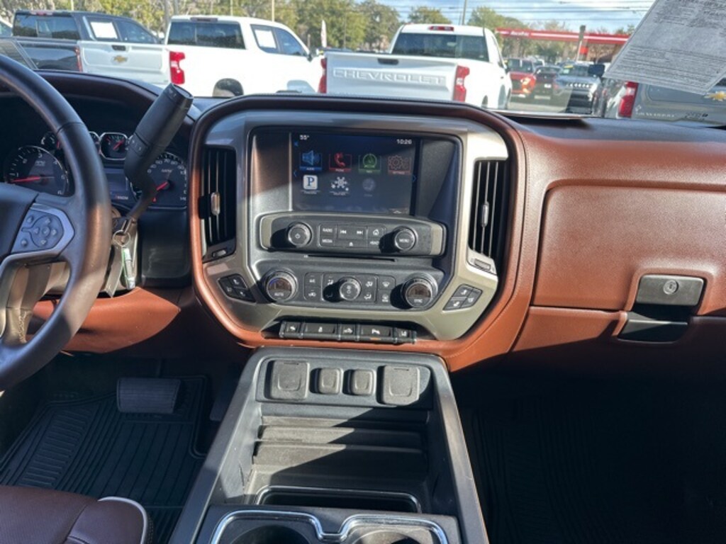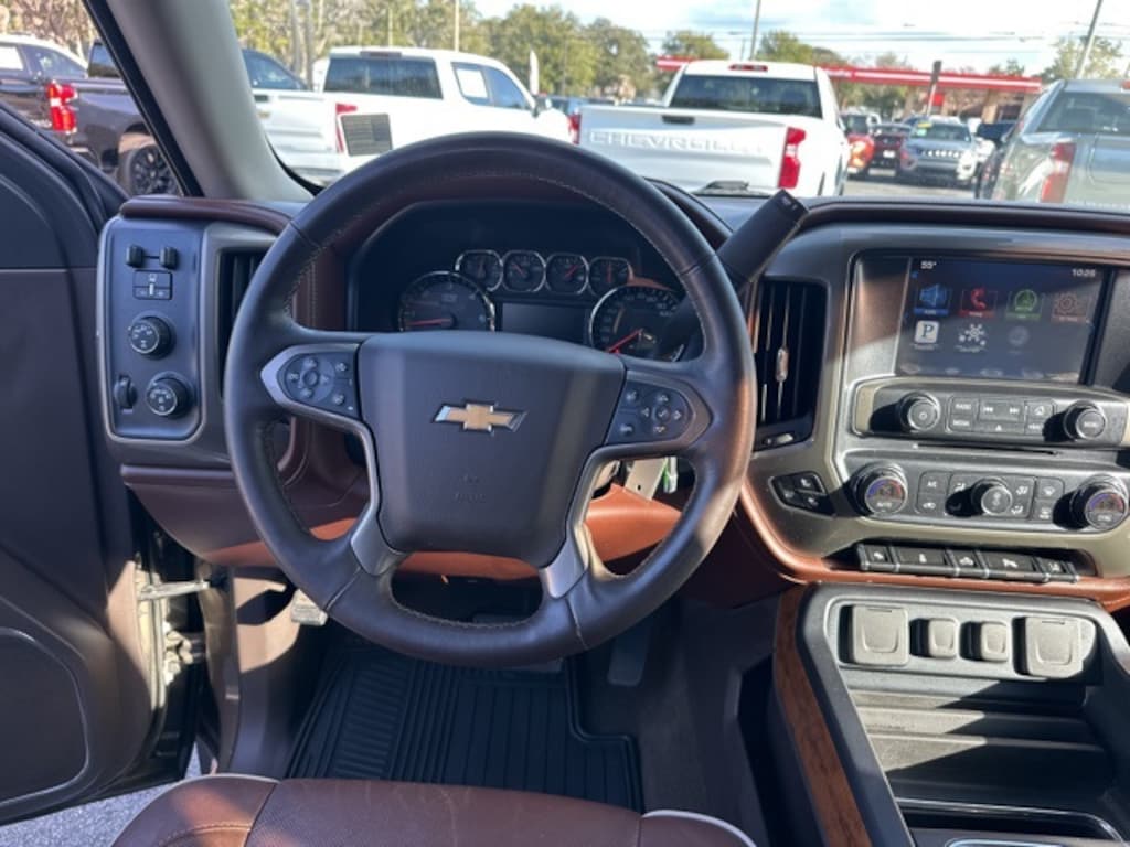 Driver Alert Package (Ultrasonic Front & Rear Park Assist), High Country Premium Package (Integrated Trailer Brake Controller, Leather Wrapped Heated Steering Wheel, and Power Adjustable Pedals), Preferred Equipment Group 3LZ (110-Volt AC Power Outlet, 150 Amp Alternator, 4.2" Diagonal Color Display Driver Info Center, Auto-Dimming Inside Rear-View Mirror, Auxiliary External Transmission Oil Cooler, Bluetooth® For Phone, Chrome Bodyside Moldings, Chrome Cap Power-Adjustable Heated Outside Mirrors, Chrome Door Handles, Chrome Grille Surround, Chrome Mirror Caps, Color-Keyed Carpeting w/Rubberized Vinyl Floor Mats, Deep-Tinted Glass, Driver & Front Passenger Illuminated Vanity Mirrors, Dual-Zone Automatic Climate Control, Electric Rear-Window Defogger, EZ Lift & Lower Tailgate, Front Halogen Fog Lamps, Heavy-Duty Rear Locking Differential, Leather Wrapped Steering Wheel w/Cruise Controls, Manual Tilt/Telescoping Steering Column, OnStar 6 Months Directions & Connections Plan, Power Sliding Rear Window, Power Windows w/Driver Express Up, Rear 60/40 Folding Bench Seat (Folds Up), Rear Vision Camera w/Dynamic Guide Lines, Rear Wheelhouse Liners, Remote Keyless Entry, Remote Vehicle Starter System, Single Slot CD/MP3 Player, Steering Wheel Audio Controls, Theft Deterrent System (Unauthorized Entry), and Universal Home Remote), Trailering Equipment, 6-Speed Automatic Electronic with Overdrive, 4WD, Saddle Leather, 3.42 Rear Axle Ratio, 4 Movable Upper Cargo Tie Downs, 4-Wheel Disc Brakes, 4" Round Chromed Tubular Assist Steps (LPO), 7 Speakers, ABS brakes, Air Conditioning, Alloy wheels, AM/FM radio: SiriusXM, Auto-dimming door mirrors, Auto-dimming Rear-View mirror, Automatic temperature control, Body Color Rear Bumper w/Cornersteps, Bodyside moldings, Bose Speaker System, Brake assist, Bumpers: body-color, CD player, Chrome wheels, Color-Keyed Carpeted Floor Mats, Compass, Cruise Control, Delay-off headlights, Driver door bin, Driver vanity mirror, Dual front impact airbags, Dual front side impact airbags, Electronic Stability Control, Emergency communication system: OnStar Directions & Connections, Floor Mounted Console, Front & Rear Molded Black Splash Guards (LPO), Front anti-roll bar, Front Body-Color Bumper, Front Bucket Seats, Front Center Armrest w/Storage, Front dual zone A/C, Front fog lights, Front Frame-Mounted Black Recovery Hooks, Front Full Feature Power Reclining Bucket Seats, Front License Plate Kit, Front reading lights, Front wheel independent suspension, Fully automatic headlights, Heated & Cooled Driver & Front Passenger Seats, Heated door mirrors, Heated front seats, Heavy Duty Suspension, Illuminated entry, LED Cargo Box Lighting, Low tire pressure warning, Memory seat, Occupant sensing airbag, Outside temperature display, Overhead airbag, Overhead console, Panic alarm, Passenger door bin, Passenger vanity mirror, Perforated Leather Appointed Seat Trim, Polished Exhaust Tip, Power door mirrors, Power driver seat, Power passenger seat, Power steering, Power Sunroof, Power windows, Premium audio system: Chevrolet MyLink, Radio data system, Radio: AM/FM 8" Diagonal Color Touch Screen, Radio: AM/FM Stereo w/8" Diagonal Color Touch Nav., Rear reading lights, Rear seat center armrest, Rear step bumper, Rear View Camera, Rear window defroster, Remote keyless entry, Security system, SiriusXM Satellite & HD Radio, Speed-sensing steering, Split folding rear seat, Steering wheel mounted audio controls, Tachometer, Telescoping steering wheel, Tilt steering wheel, Traction control, Trip computer, Turn signal indicator mirrors, Universal Garage Door Opener, Variably intermittent wipers, Ventilated front seats, Voltmeter, Wheel Locks (Set of 4) (LPO), and Wheels: 20" x 9" Chrome. 6-Speed Automatic Electronic with Overdrive, 4WD, Saddle Leather, 110-Volt AC Power Outlet, 150 Amp Alternator, 3.42 Rear Axle Ratio, 4 Movable Upper Cargo Tie Downs, 4-Wheel Disc Brakes, 4.2" Diagonal Color Display Driver Info Center, 4" Round Chro